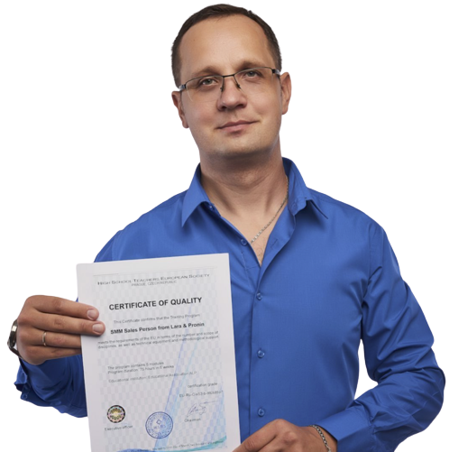 Виталий Пронин, декан факультета "Digital-маркетинга и социальных медиа от Лары и Пронина", с сертификатом качества о соответствии курса нормам ЕС к онлайн-обучению, как профессиональному учебному заведению. 2018 год
